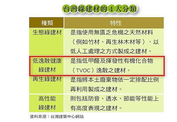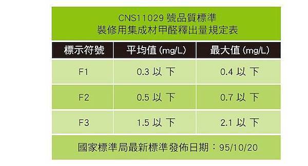 2006年,世界衛生組織正式公佈甲醛為一級致癌物,同年10月20日經濟部商品檢驗局開始要求合板中甲醛含量,板材必須符合至少F3的標準; 建築技術規則施工編第321條,也在當年將室內裝修材料的綠建材使用面積,從裝修面積的5%上修到30%,並且於2012年研修調整到45%。